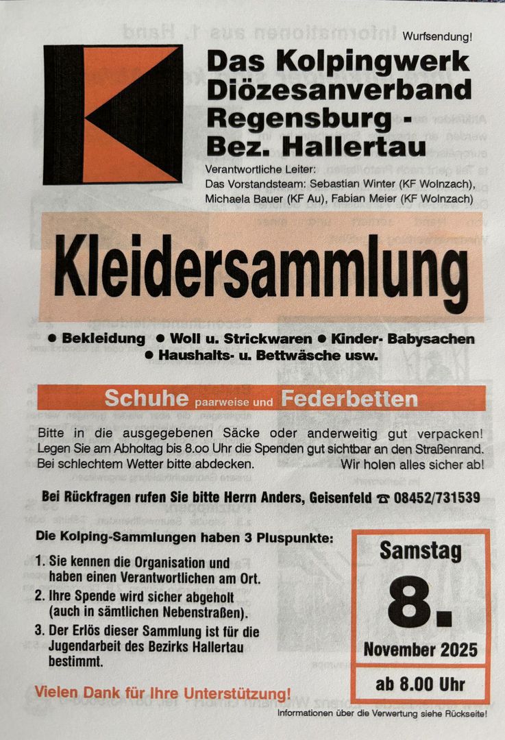 Die Kolpingsfamilie Geisenfeld führt am Samstag, den 08.11.2025 ihre Gebrauchtkleidersammlung in der Großgemeinde Geisenfeld und Ernsgaden durch: